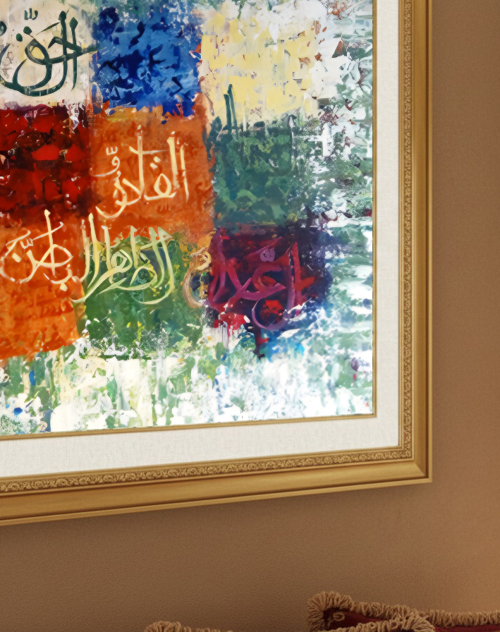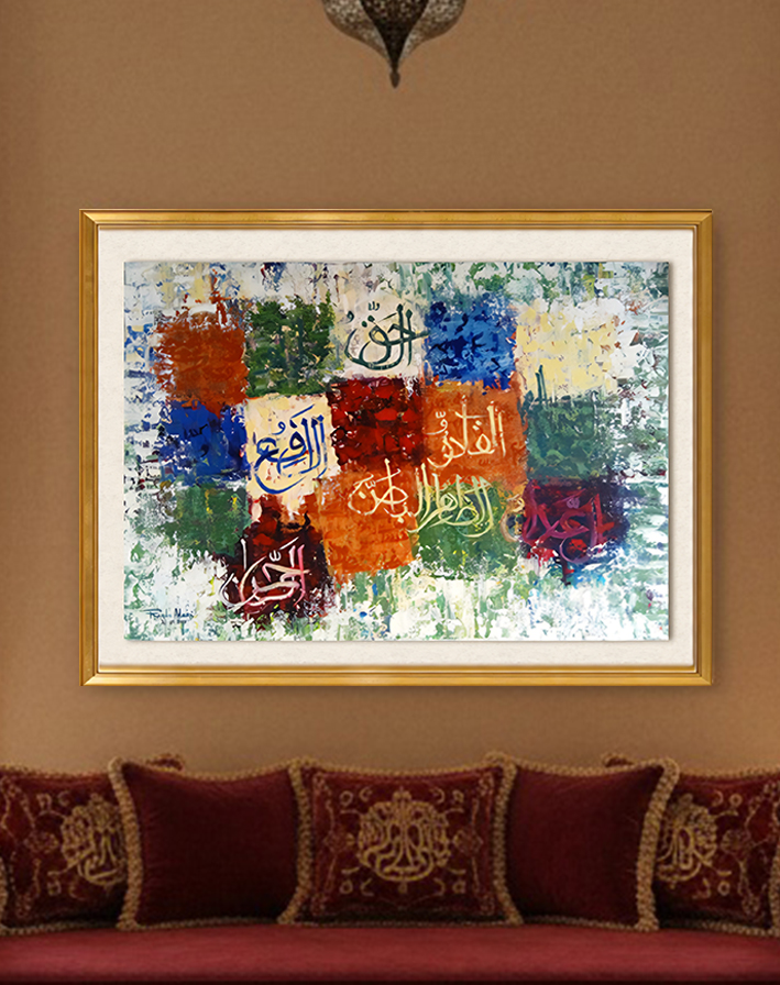 Cette peinture élégante incarne un mélange harmonieux d’art abstrait contemporain et de l’esthétique de la calligraphie arabe. La peinture est encadrée d’un cadre en or élégant qui ajoute à son luxe.